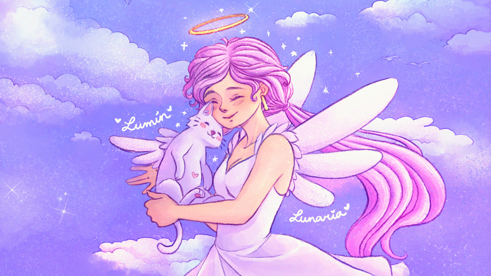 Let the calm and tender energy of Lunaria and her playful angelic kitten, Lumín, brighten your devices. This free wallpaper pack includes a dreamy illustration of these beloved characters, available in optimized resolutions for PC, mobile, and tablet.